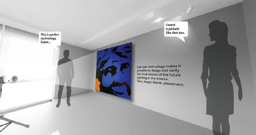 My own technology makes it possible to design and verify the final version of the future painting in the interior, before final production. Design, size, shape, frame, location.